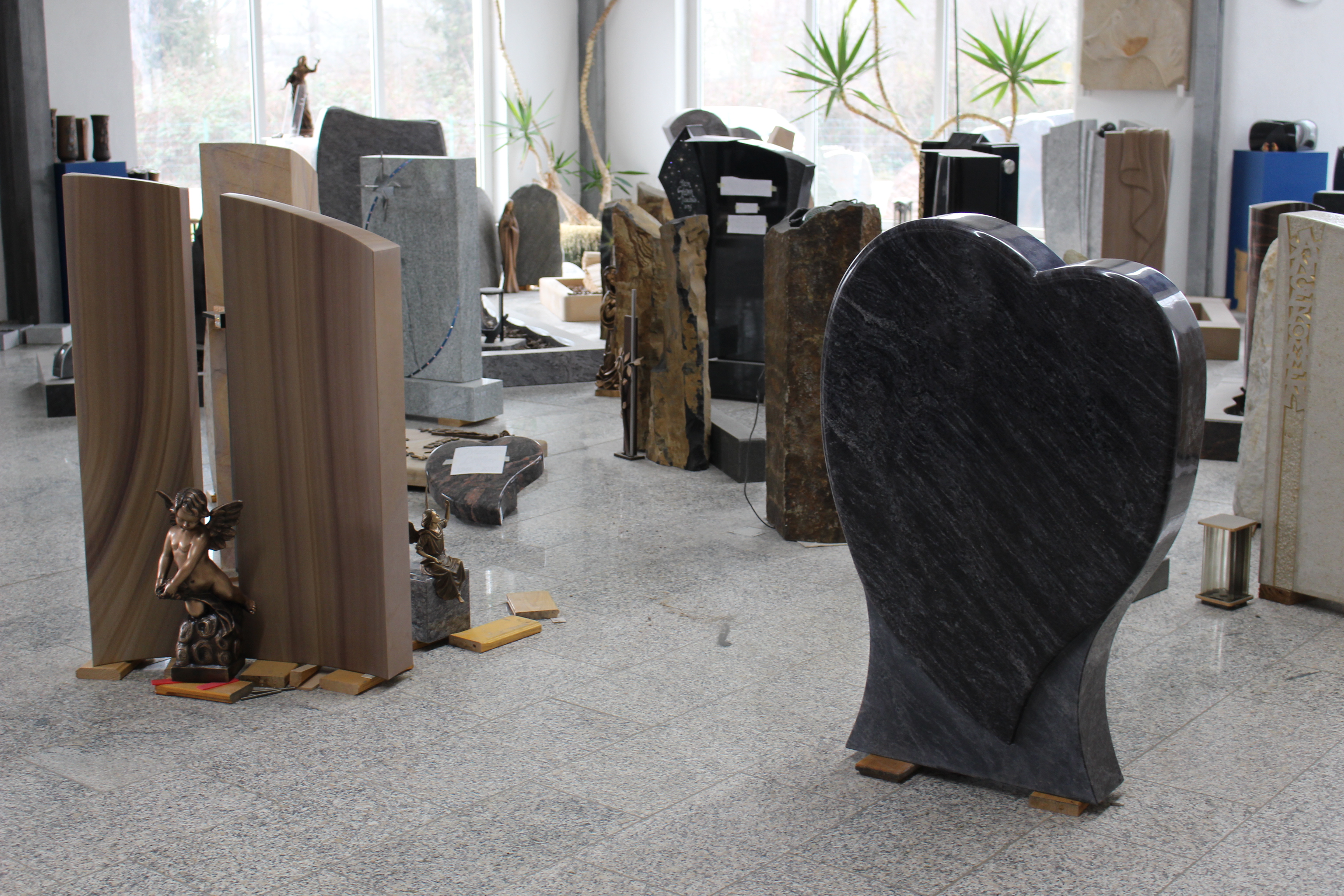 Grabsteine und Skulpturen in unseren Ausstellungsräumen.